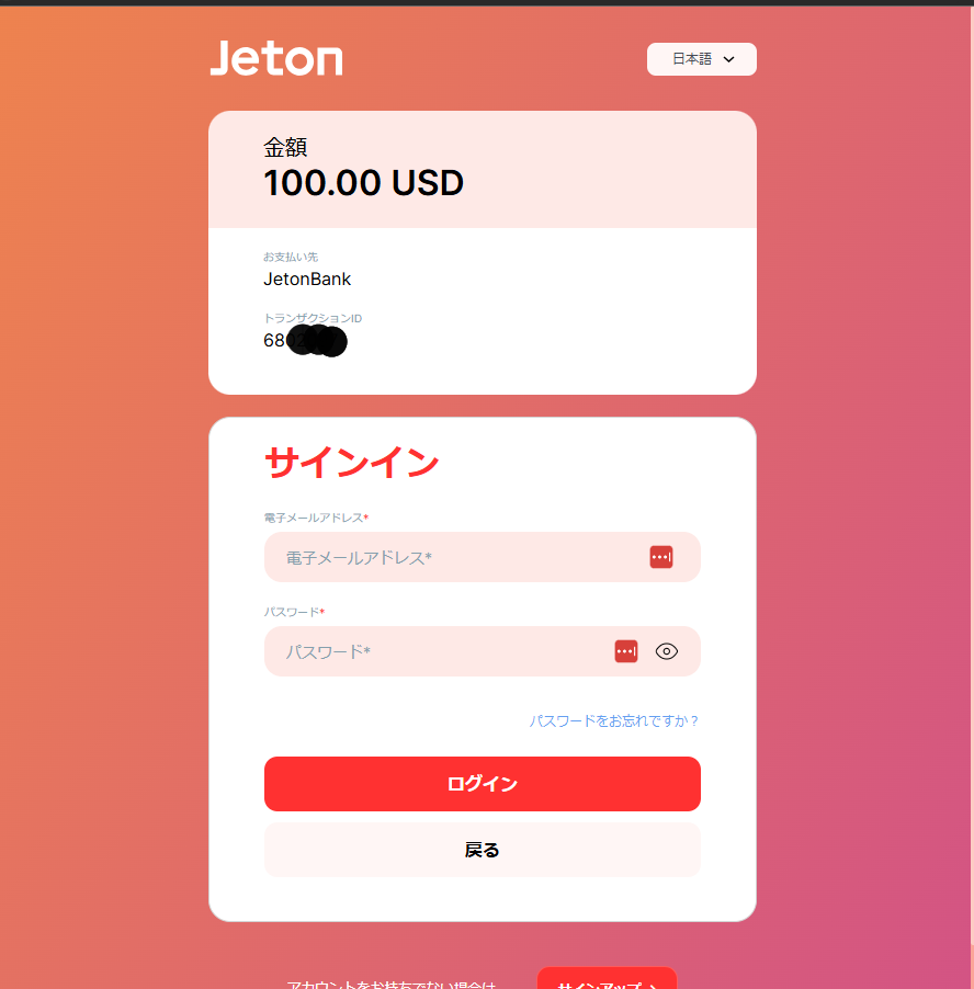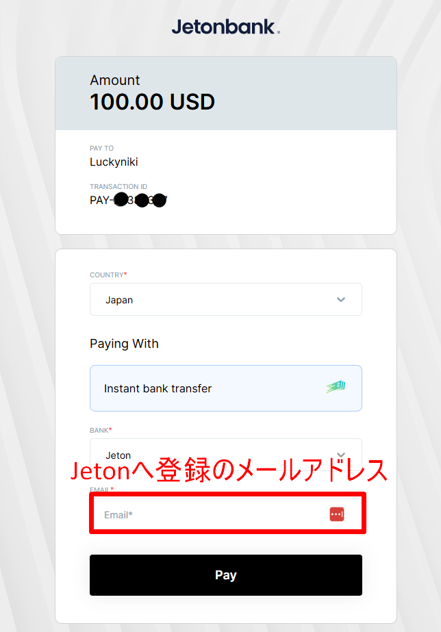 3. 新規ウィンドウで下記画面が表示されます。自動で開かない場合は、「支払い方法ページ」をクリックすると開きます。Jetonに登録しているメールアドレスを入力して、「Pay」。