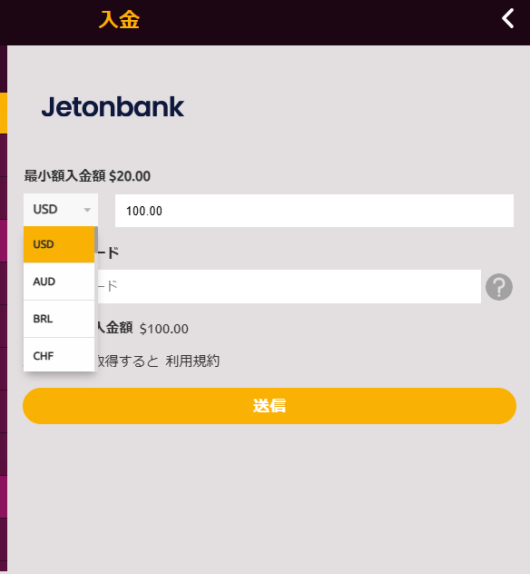2. 利用希望の通貨を選択し、入金額を入力したら、「送信」をクリック